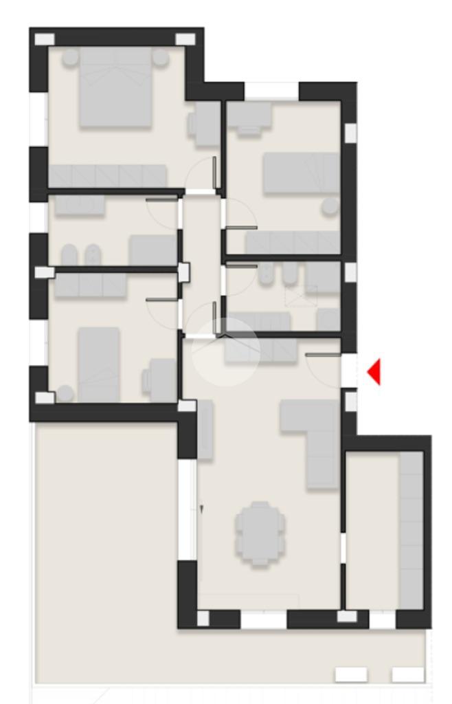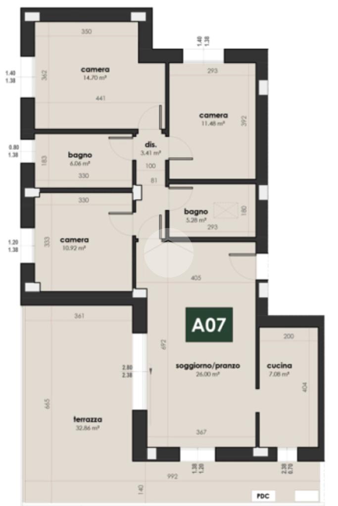 L'immobile, sito all'ultimo piano, sarà così composto: ingresso, soggiorno con accesso alla terrazza di 32 mq completa di loggia, cucina abitabile, disimpegno zona notte, tre camere da letto (una matrimoniale, una singola ed una doppia) e due bagni (entrambi finestrati).