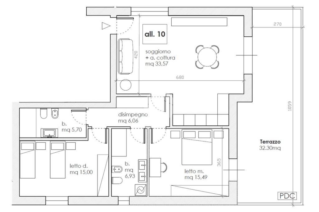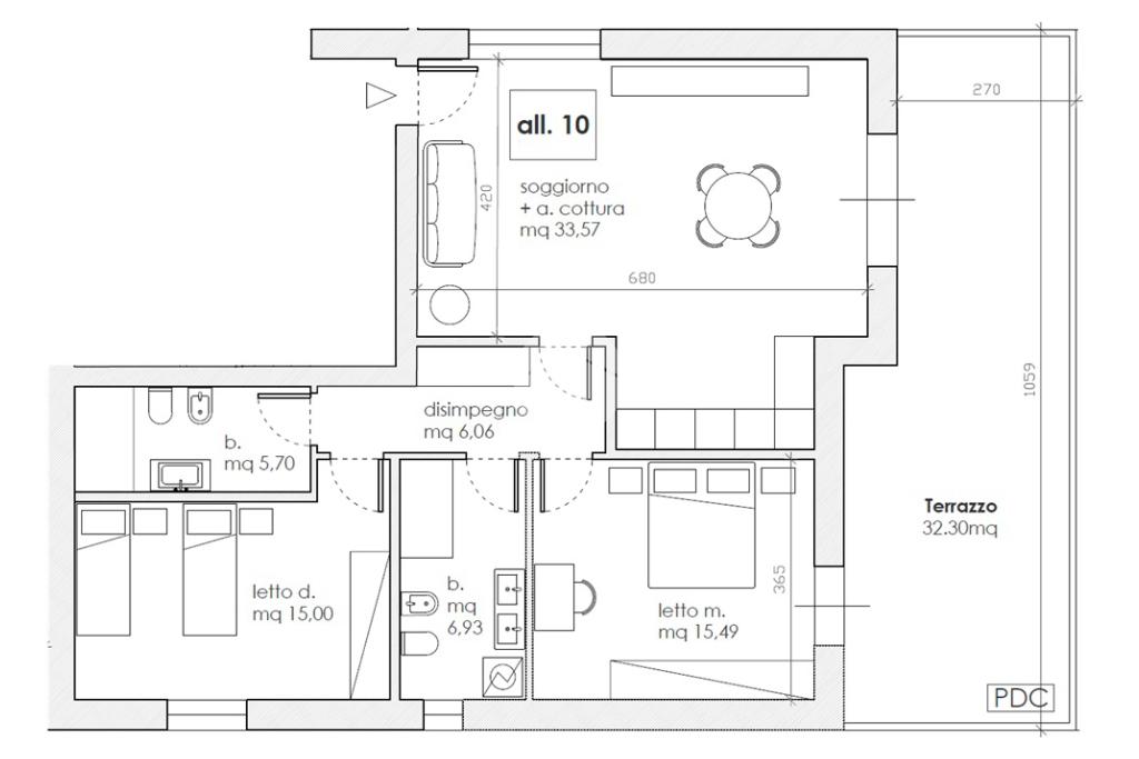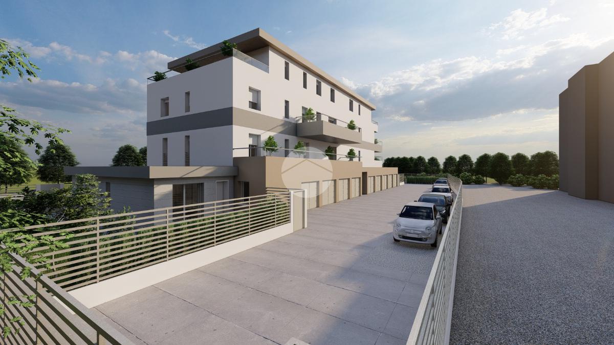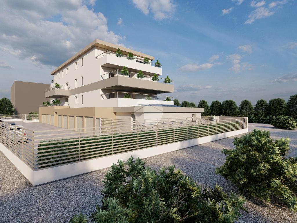 L'immobile, sito al terzo ed ultimo piano, sarà così composto: ingresso su soggiorno con angolo cottura con accesso al terrazzo di circa 32 mq, due camere matrimoniali, disimpegno zona notte, due bagni (uno finestrato ed uno cieco); completano la proprietà un'autorimessa con annessa cantina.