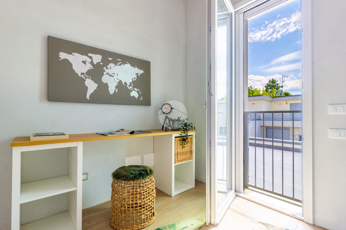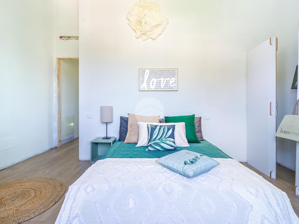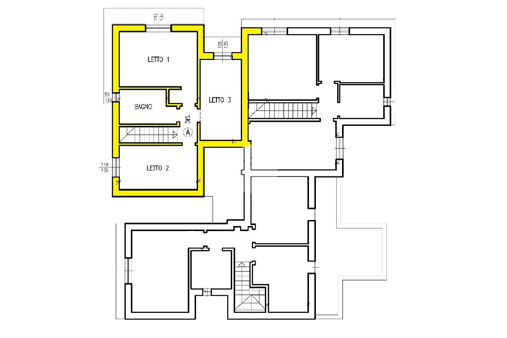 SOLUZIONE A: ingresso indipendente su giardino di proprietà in parte pavimentato di 133mq, soggiorno con cucina a vista, ripostiglio, bagno ed accesso interno all'autorimessa; tramite scala interna si raggiunge il primo piano con le tre camere da letto (una matrimoniale e due singole), bagno e balcone.