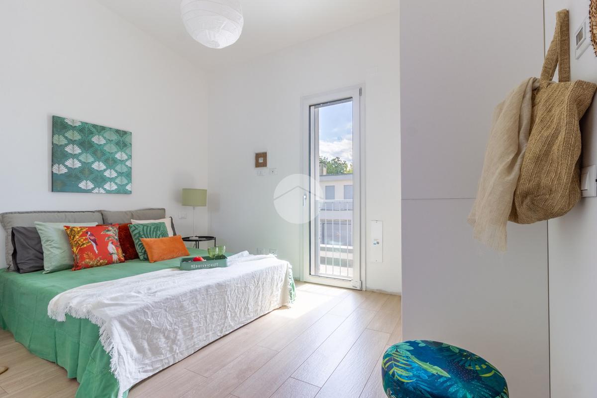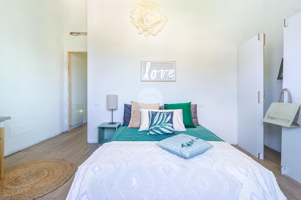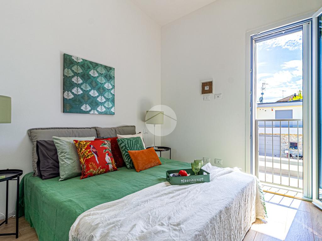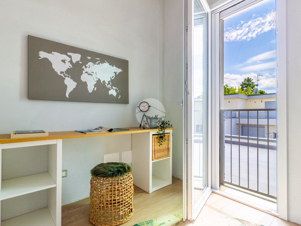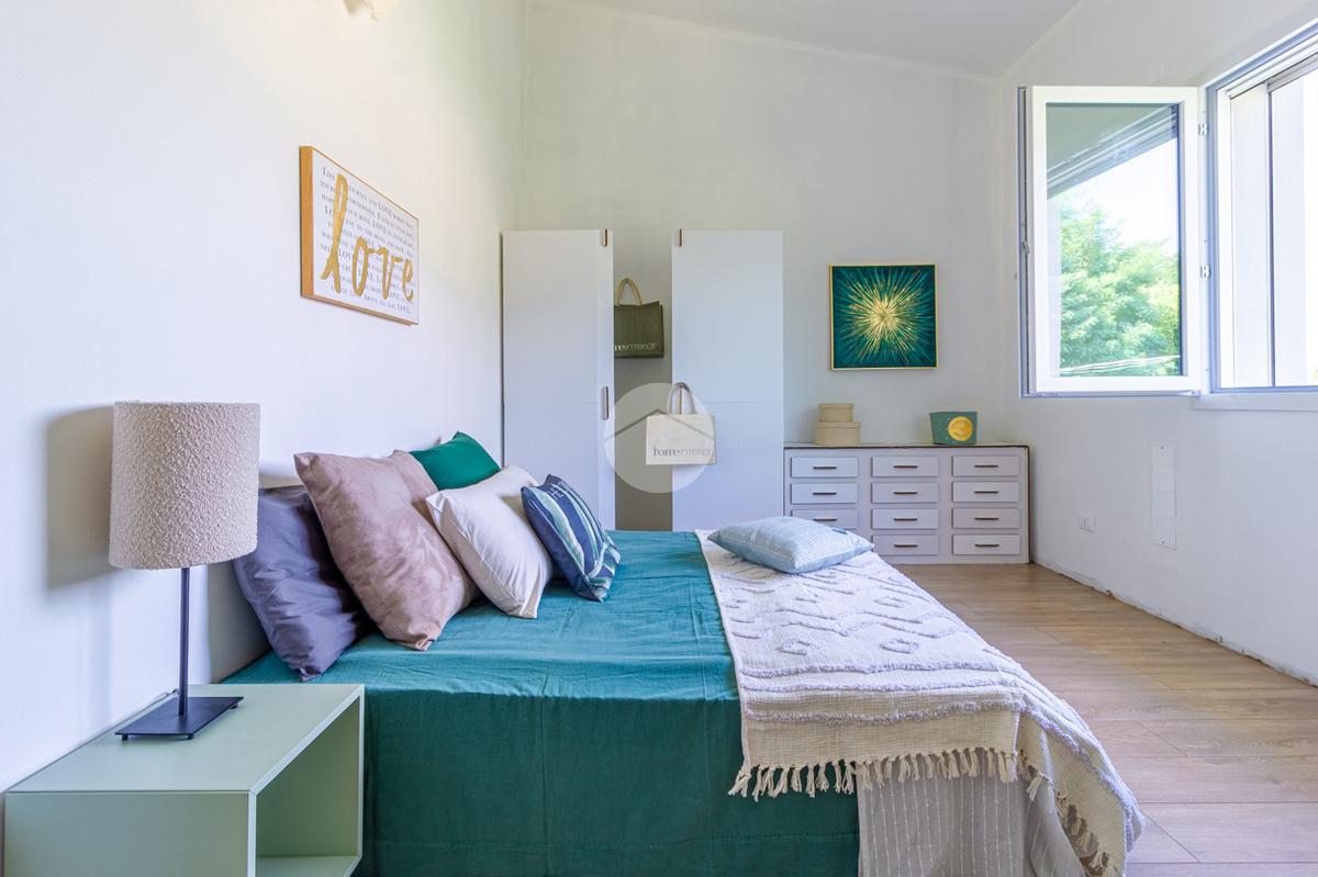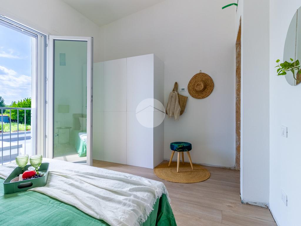SOLUZIONE C: ingresso indipendente su giardino di proprietà in parte pavimentato di 90mq, soggiorno con cucina a vista, ripostiglio, bagno ed accesso interno all'autorimessa; tramite scala interna si raggiunge il primo piano con le tre camere da letto (una matrimoniale e due singole), bagno e due balconi.